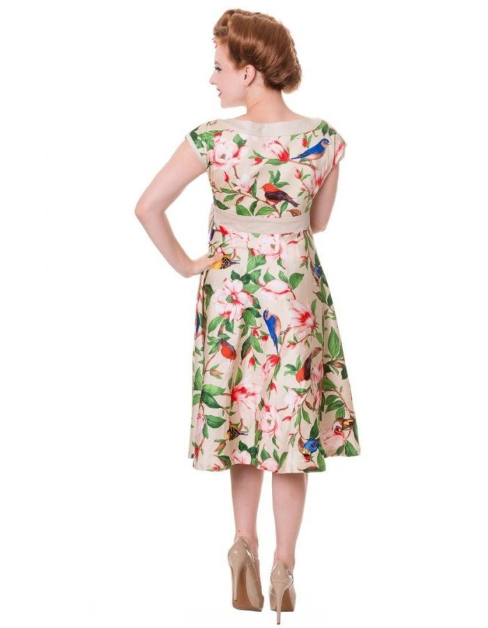 Banned Wonderful Beige Exotic Birds Floral Swing Rockabilly Dress