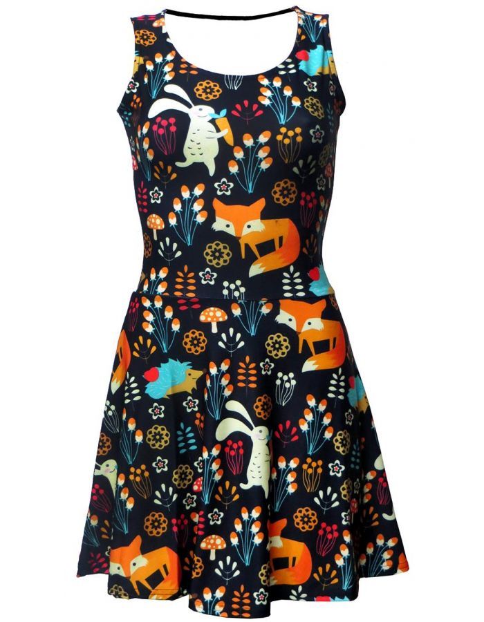 Fox, Rabbit And Hedgehog Animal Nature Print Fit & Flared Sleeveless Skater Dress