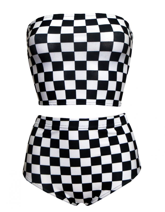Monochrome Chequered Chess Board Crop Bandeau High Waist Bikini Pants Coord Set