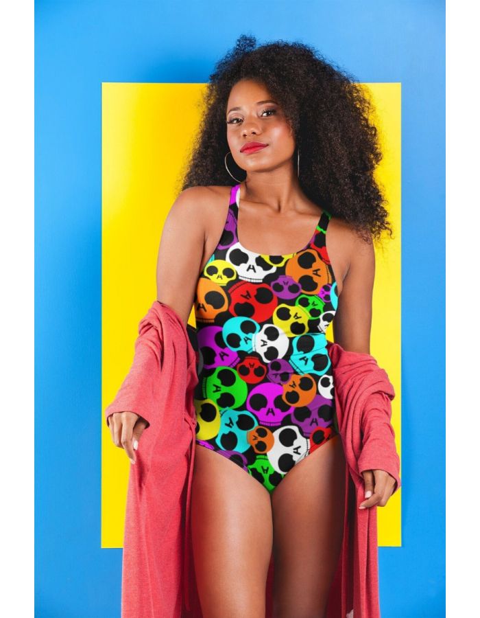Multicolour Rainbow Colourful Funky Skulls Alternative Printed Swimsuit Bodysuit