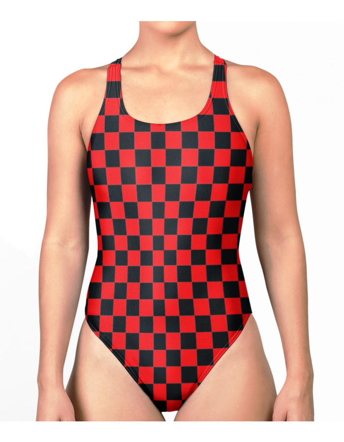 Red And Black Coloured Check Squares Printed Swimsuit Bodysuit