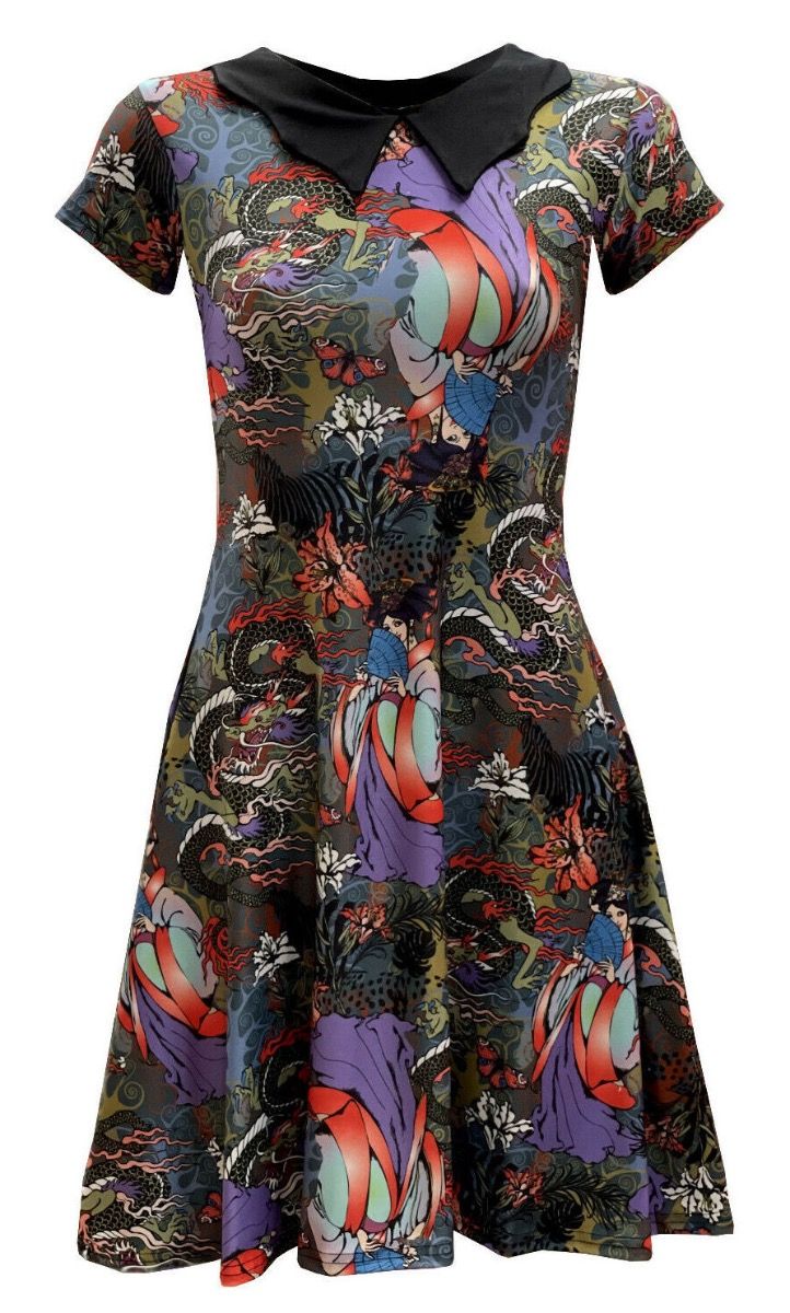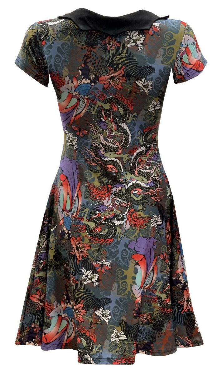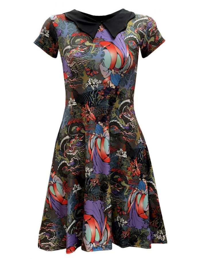 Traditional Japanese Doll Peacock Floral Fairies Dragon Printed Collar Dress