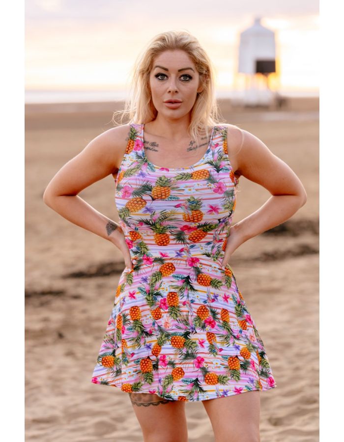 Tropical Floral Exotic Pineapple Birds Stripe Pattern Print Sleeveless Skater dress.