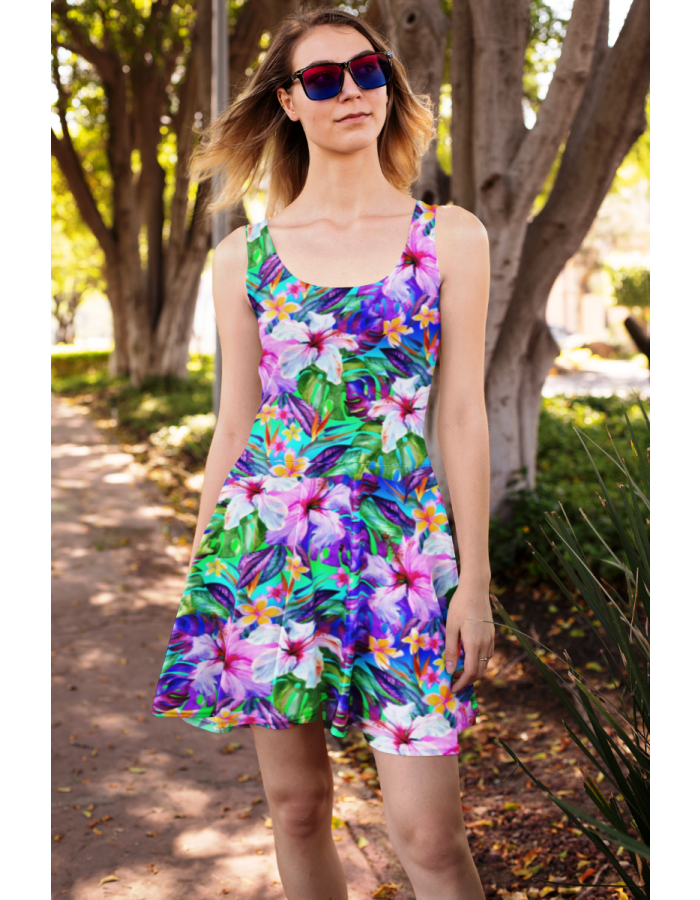 Tropical Floral Watercolour Exotic Palm Leaves Retro Vintage All Over Printed Fit & Flared Sleeveless Skater Dress