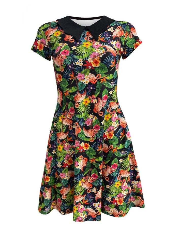 Tropical Flowers Floral Flamingo Printed Bats Collar Skater Dress