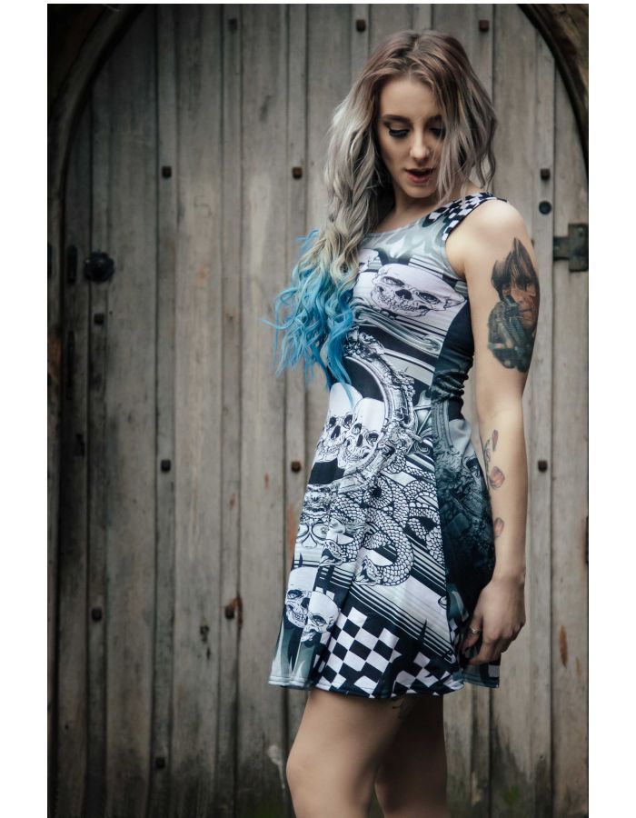 Women’s Gothic Flames Skulls Snakes Chequer Print Skater Flare Dress