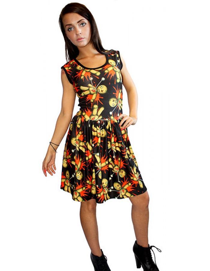 Women's Unique Cute Voodoo Doll Print Rockabilly Swing Sleeveless Gathering Dress Goth Punk Emo