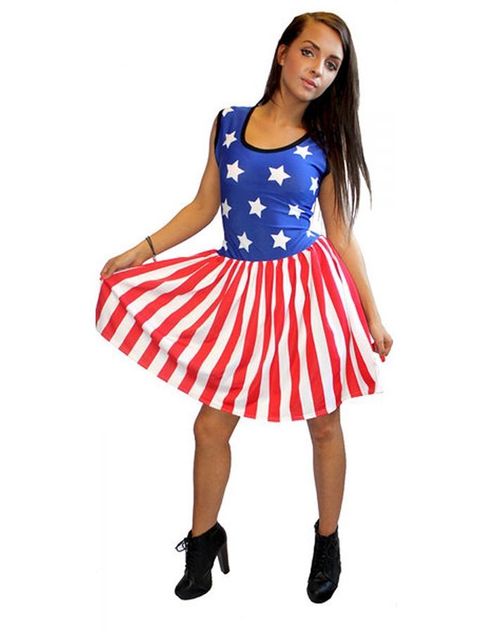 Women's Unique USA Flag Stars And Stripes Print Rockabilly Swing Sleeveless Gathering Dress